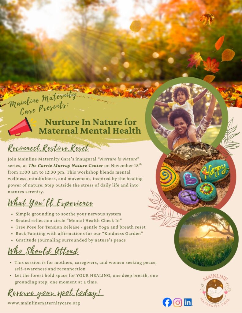 Join Mainline Maternity Care’s inaugural Nurture in Nature series at the Carrie Murray Nature Center on November 18th from 11:00am to 12:30pm. This workshop blends mental wellness, mindfulness, and movement, inspired by the healing power of nature. Step outside the stress of daily life and into natures serenity. Our hope is to create a space where mothers can slow down, breathe, and feel restored; mind, body, and spirit.